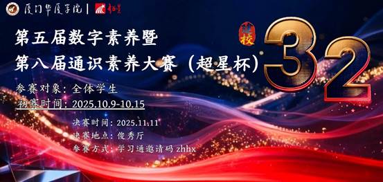 在庆祝厦门华厦学院建校三十二周年之际,由我校通识教育中心、数字素养教育办公室、校学生处、校团委联合主办,通识教育学生工作室承办,超星集团有限公司协办的“厦门华厦学院第五届数字素养暨第八届通识素养大赛(超星杯)”于11月11日下午在俊秀报告厅顺利举办。