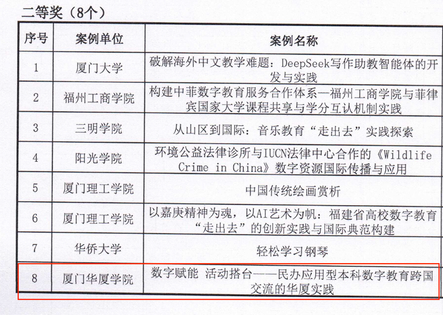近日,从福建省高校在线教育联盟传来捷报,在“数字教育‘走出去’典型案例”征集活动中,由我校申报的案例《数字赋能活动搭台——民办应用型本科数字教育跨国交流的华厦实践》,荣获二等奖。这一荣誉不仅是对我校数字教育建设成果的充分肯定,更是我校在国际化交流与合作道路上,以数字技术破局,展现民办高校特色与活力的生动实践。